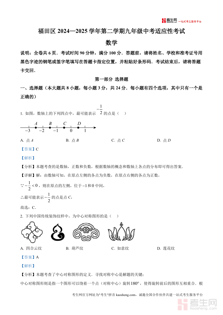 《精品解析:2025年广东省深圳市福田区中考一模数学试题(解析版).docx》是一份针对2025年广东省深圳市福田区九年级中考适应性考试(即中考一模) 的数学学科备考资料。该资料对应福田区2024—2025学年第二学期九年级数学阶段性检测需求,包含完整试题及配套解析内容,严格遵循区域中考模拟考试的数据规范(如全卷页数、考试时间、满分分值等),贴合本地考情特点编制而成。它旨在提供与实际考试高度一致的数据呈现形式,确保资料与区域中考备考节奏相匹配。