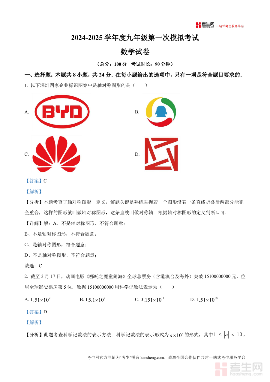 《精品解析:广东省深圳市南山区哈工大实验学校2024-2025学年九年级下学期第一次模拟考试数学试题(解析版).docx》是一份针对广东省深圳市南山区哈工大实验学校2024-2025学年九年级下学期第一次模拟考试数学学科试题制作配套解析资料。该资料对应特定学年、学校及考试阶段,聚焦九年级下学期首次数学模拟考试内容框架,为使用者提供与该次考试直接相关的数据支持与参考依据,不涉及超出该次考试范围之外的额外知识点或题型拓展。