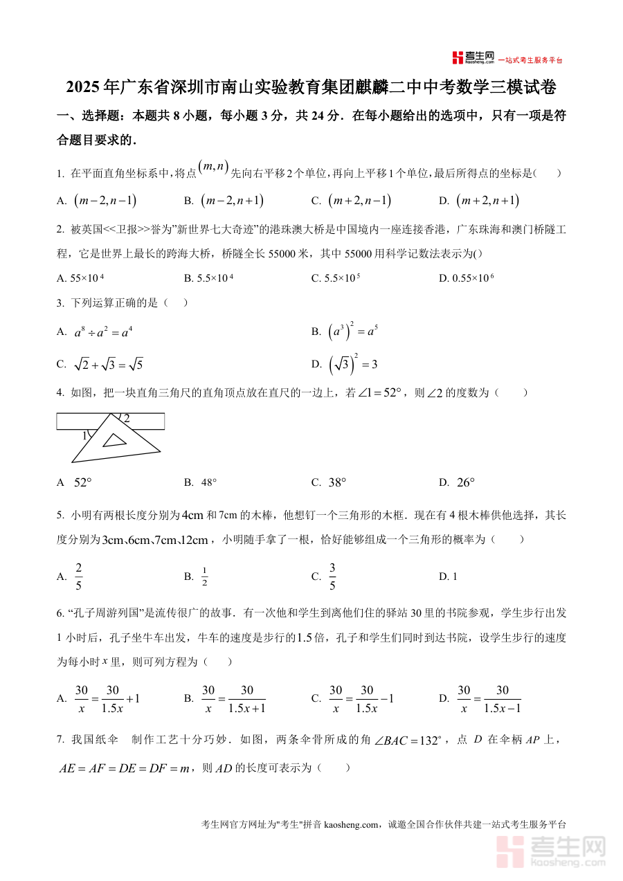 《精品解析:2025年广东省深圳市南山实验教育集团麒麟二中中考数学三模试卷(原卷版)》是一份面向2025年广东省深圳市南山实验教育集团麒麟二中初三学生编制的中考数学第三轮模拟测试原卷资料。该试卷紧密贴合当地中考数学的命题趋势与学校的教学进度,属于学校中考备考体系中的关键阶段性检测材料,为相关使用者提供了符合该校教学实际与中考要求的测试载体。