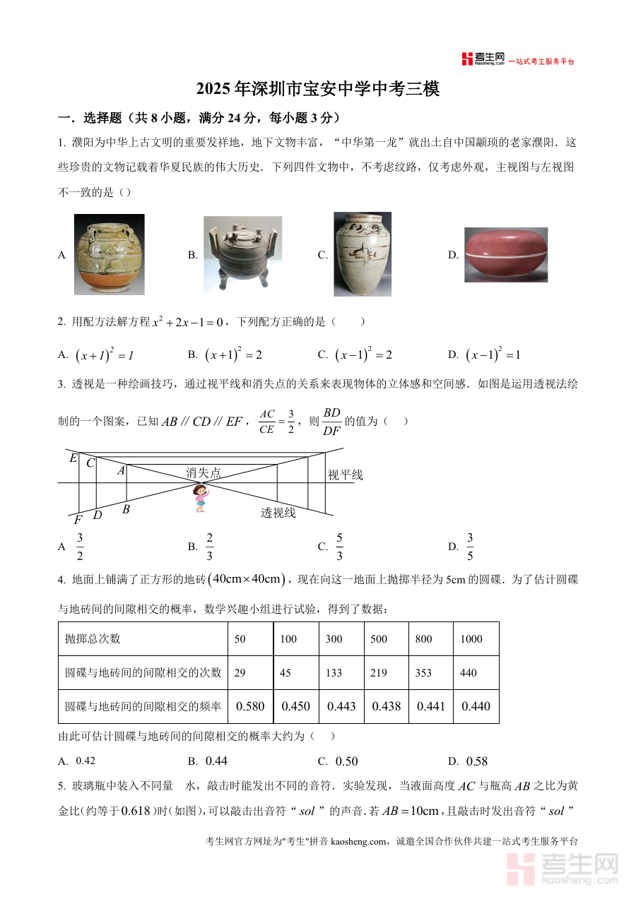 《精品解析:2025年广东省深圳市宝安中学中考三模数学试题(原卷版).docx》是一份针对2025年广东省深圳市宝安中学初三学生开展中考三模考试的数学学科原卷类备考资料。该资料依托宝安中学中考三模考试设置,完整呈现此次考试数学科目的原卷形式,为相关使用者提供贴合该校三模考试实际情况的资料载体,不包含额外解析或拓展内容,仅保留原卷本身结构与题目呈现。