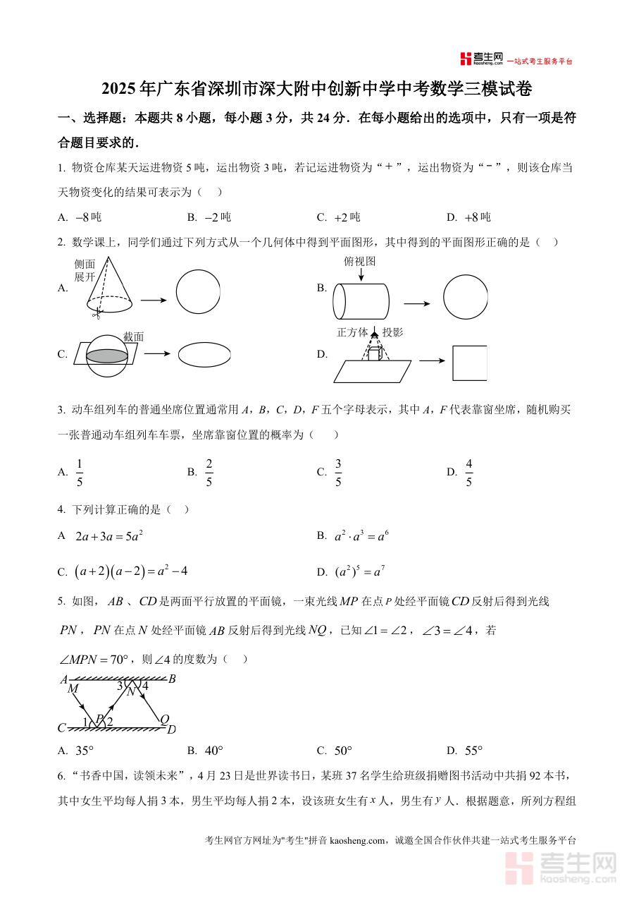《精品解析:2025年广东省深圳市深大附中创新中学中考数学三模试卷(原卷版).docx》是一份针对2025年广东省深圳市深大附中创新中学中考数学三模考试设计的备考资料。该资料依托该学校特定的考试场景,呈现了中考数学三模考试原卷形态,能够帮助使用者提前接触真实考试框架,熟悉考试整体结构。作为原卷版资料,它保留了考试的原始呈现形式,为使用者提供了直接了解考试布局的途径。