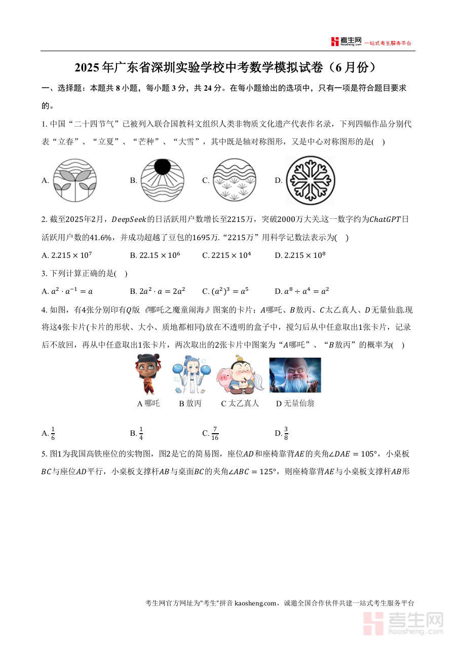 这份资料主要用于深圳实验中学初三学生在6月份开展中考数学模拟测试。通过完成该试卷,学生可在接近中考的时间节点进行全面自我检测,清晰了解自身对数学知识模块的掌握程度;教师也能借助试卷结果及时掌握学生的备考状态,精准调整后续复习计划。此外,它还能助力学生熟悉中考数学的分值分布与答题规范,提升应试技巧与时间管理能力,为正式中考做好充分准备。