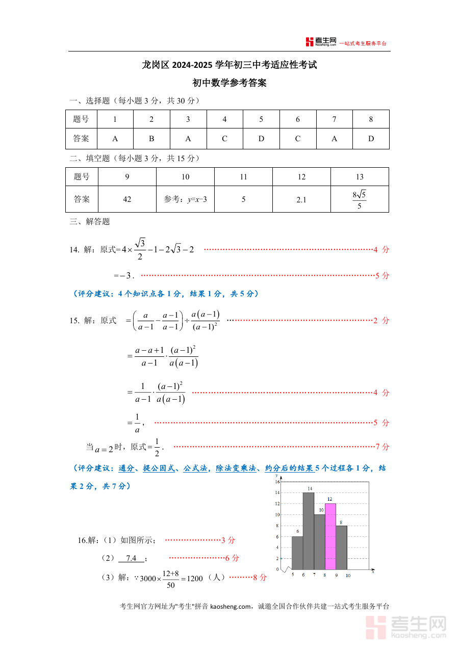 该资料适用于广东省深圳市龙岗区2024-2025学年的初三学生、初中数学教师以及中考备考辅导人员。作为中考前阶段性适应性检测的配套答案,它能够帮助考生明确自身知识掌握程度与答题中的不足,为后续复习提供精准方向;同时为教学人员提供统一的评分依据与备考规划参考,助力提升区域中考数学备考效率与质量,是该阶段备考过程中的重要辅助材料之一。