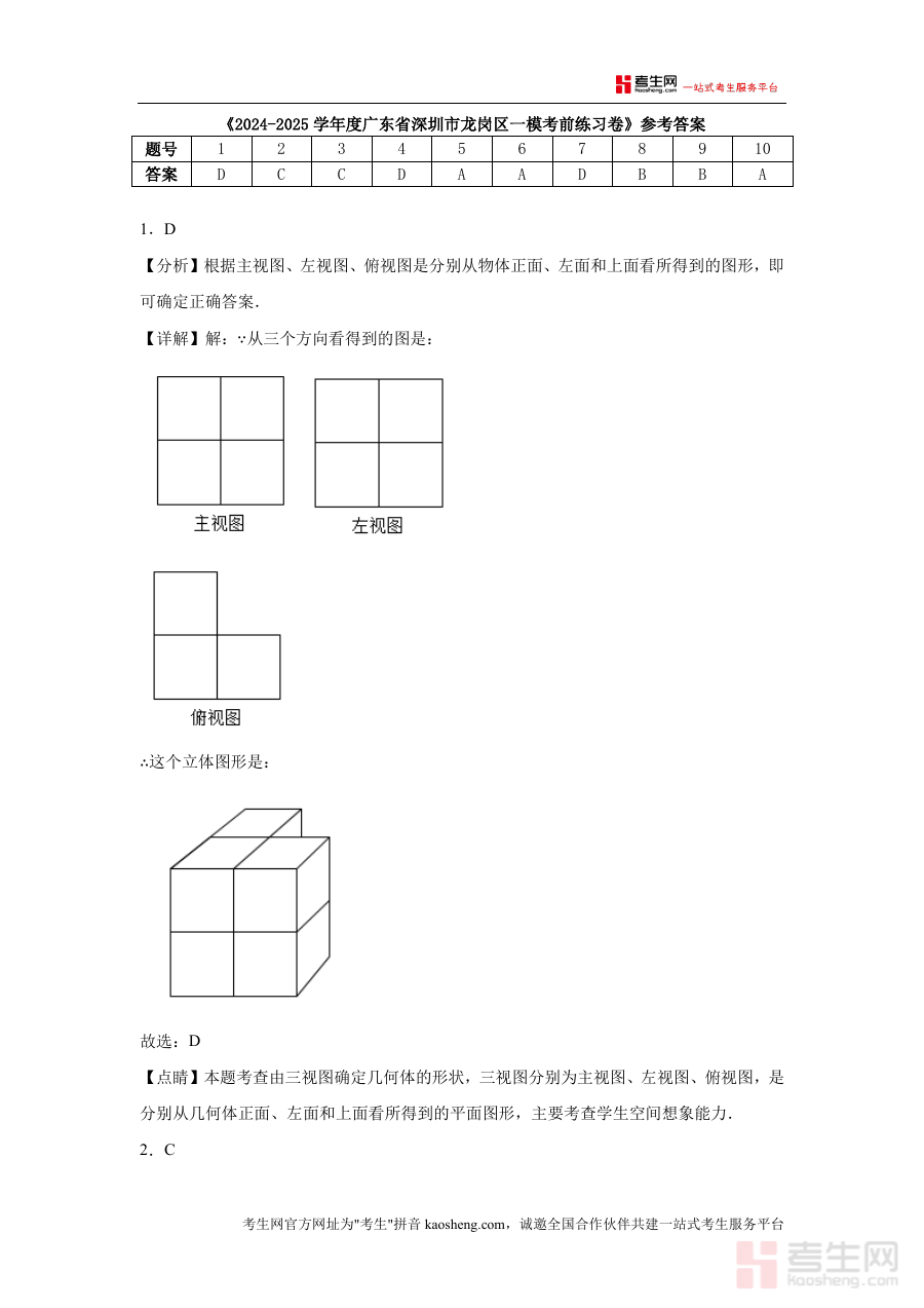 这份参考答案资料主要用于使用者在完成龙岗区一模考前练习卷后进行答案核对,通过对照参考答案及附带解析(如部分题目给出解题思路、方法提示等),了解自身答题情况,发现存在问题与不足,同时可借助解析内容理解题目考查要点及正确解题路径,为后续针对一模考试备考调整学习重点、优化解题方法提供参考依据。