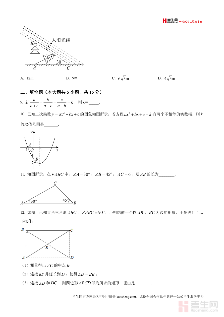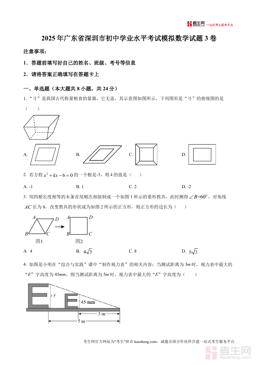 《精品解析:2025年广东省深圳市初中学业水平考试模拟数学试题3卷(原卷版).docx》是一份面向2025年广东省深圳市初中学业水平考试设计的数学模拟备考资料,对应考试类型为初中学业水平考试模拟测试,是该系列模拟试题中的第三卷原卷版本。这份资料严格贴合深圳市初中学业水平考试相关要求,为备考者提供符合本地考试情境与规范的练习载体,助力其提前适应考试环境与形式。