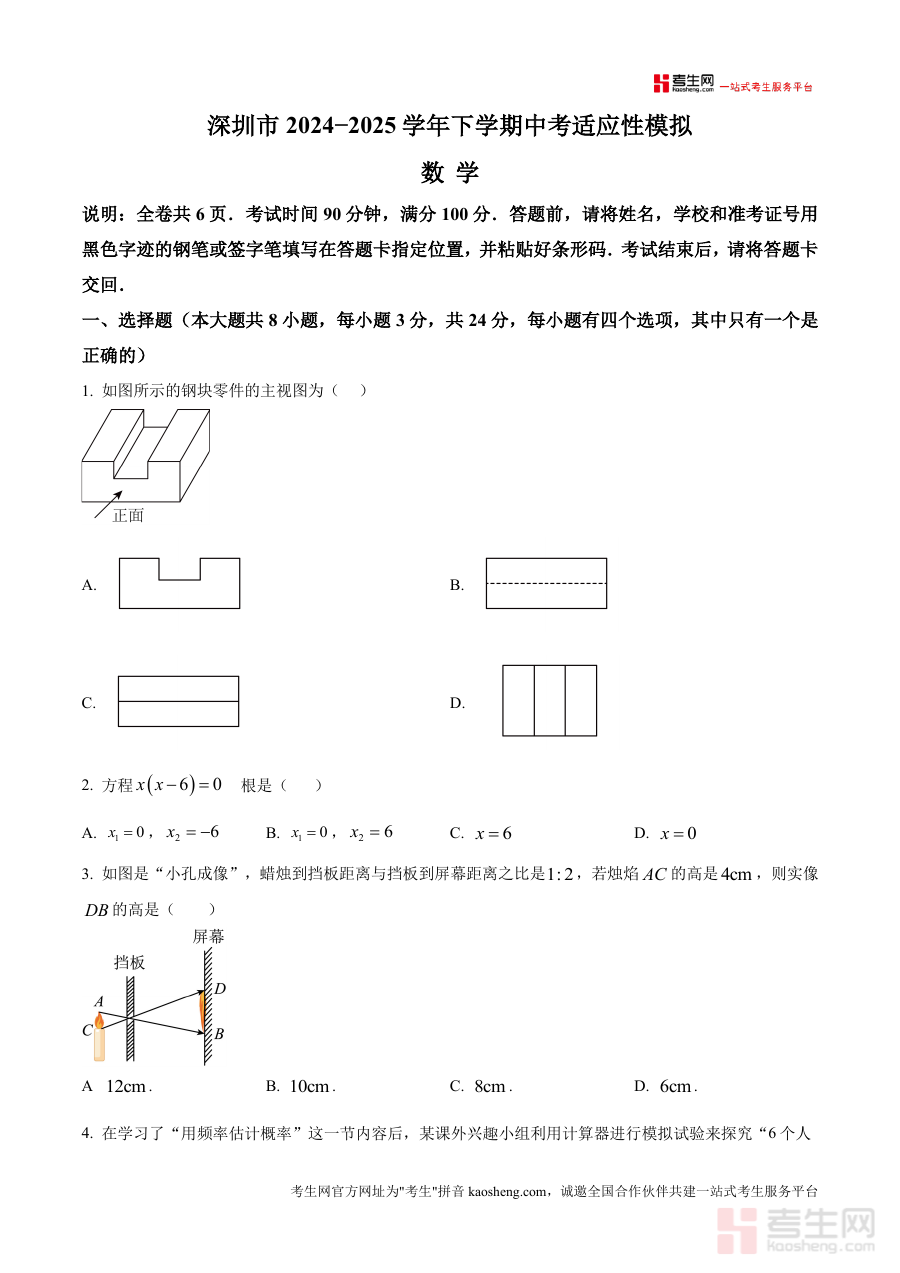该资料适用于广东省深圳市初三学生及从事中考数学备考辅导的教师或相关人员。作为中考适应性模拟试卷原卷版,它能帮助学生直观了解自身对中考数学相关内容掌握程度及应试能力水平;对于辅导者而言,可借助这份资料把握本地中考模拟考试命题方向与形式特点,据此制定针对性备考计划或调整教学策略,具有较高阶段检测与参考价值。