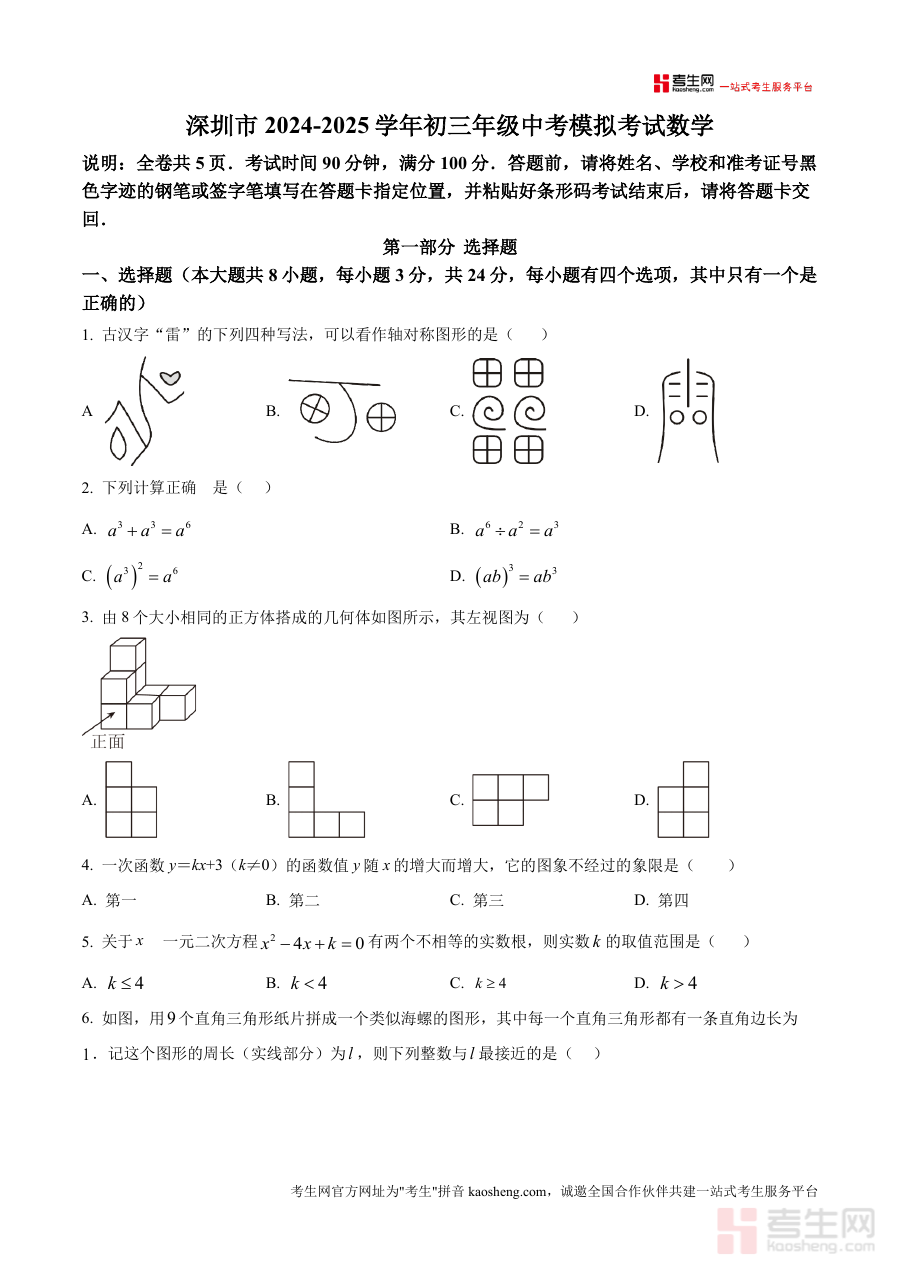 《精品解析:广东省深圳市罗湖区部分学校2024-2025学年下学期九年级4月中考模拟考试数学试卷(原卷版).docx》是一份面向广东省深圳市罗湖区部分学校九年级学生设计的中考模拟数学原卷资料,对应时间为2024-2025学年下学期4月。从文件内容片段可知,该试卷全卷共5页,考试时长设置为90分钟,满分100分,答题前需按规范填写姓名、学校及准考证号并粘贴条形码,考试结束后交回答题卡,完全贴合中考数学考试的基本流程与要求。