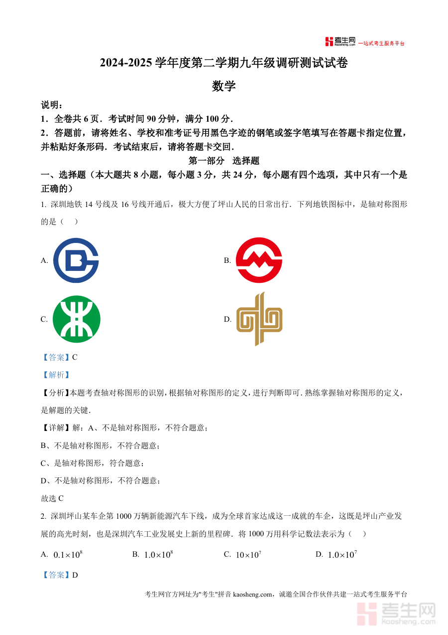 《精品解析:2025年广东省深圳市坪山区中考二模数学试卷(解析版).docx》是一份针对2025年广东省深圳市坪山区九年级中考二模数学考试的专业备考资料。该资料对应2024-2025学年度第二学期九年级调研测试,聚焦坪山区中考二模这一关键阶段检测环节,为相关备考活动提供结构化的解析类支持,其内容框架与坪山区中考二模数学考试的实际要求相契合。