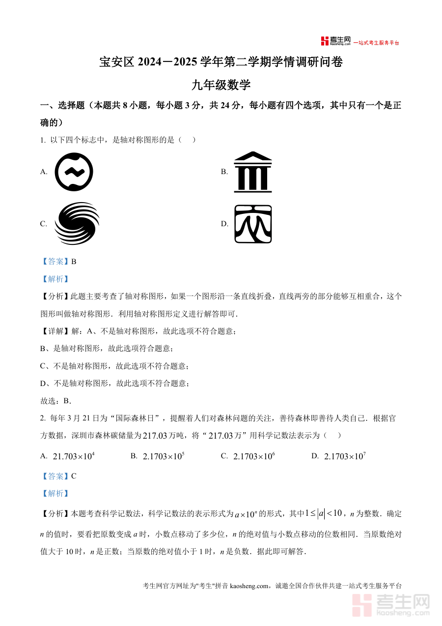 《精品解析:2025年广东省深圳市宝安九年级中考二模数学试题(解析版)》是一份针对2025年广东省深圳市宝安区九年级中考二模数学考试编写而成的配套解析类备考资料。该资料严格对应宝安区2024-2025学年第二学期学情调研问卷中的九年级数学试题,完整呈现了此次二模考试数学科目的全部试题及详细解析内容,为使用者提供该次考试官方试题及专业解析方面的参考支持。
