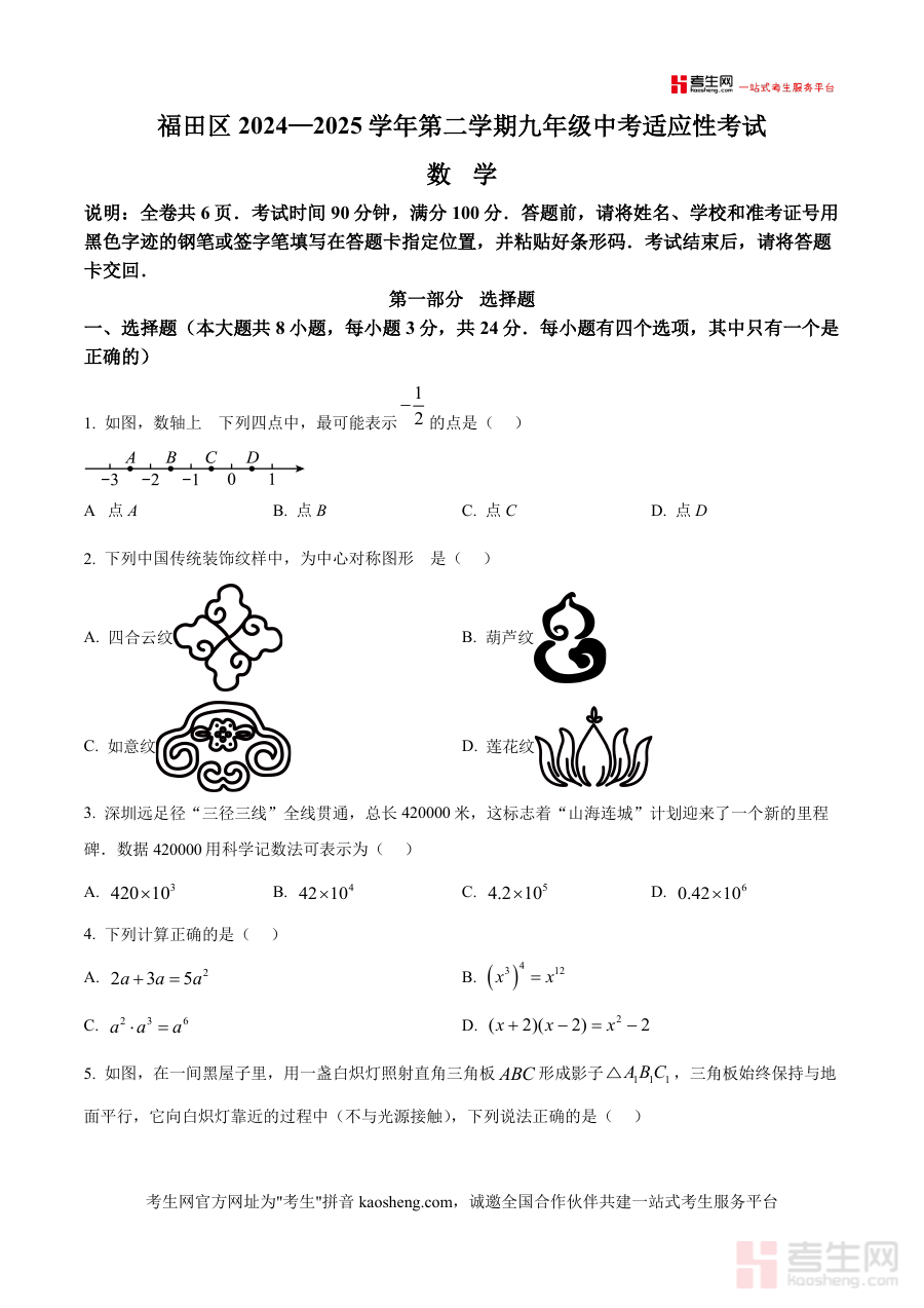 《精品解析:2025年广东省深圳市福田区中考二模数学试卷(原卷版)》是一份针对2025年广东省深圳市福田区中考二模数学考试编制的备考资料,对应福田区2024—2025学年第二学期九年级中考适应性考试中的数学科目测试内容。该资料包含此次中考二模数学考试的原卷呈现形式及官方发布的考试说明信息,如试卷总页数、考试时间长度、满分分值等基础考试要素,为使用者提供真实的试卷样例参考。