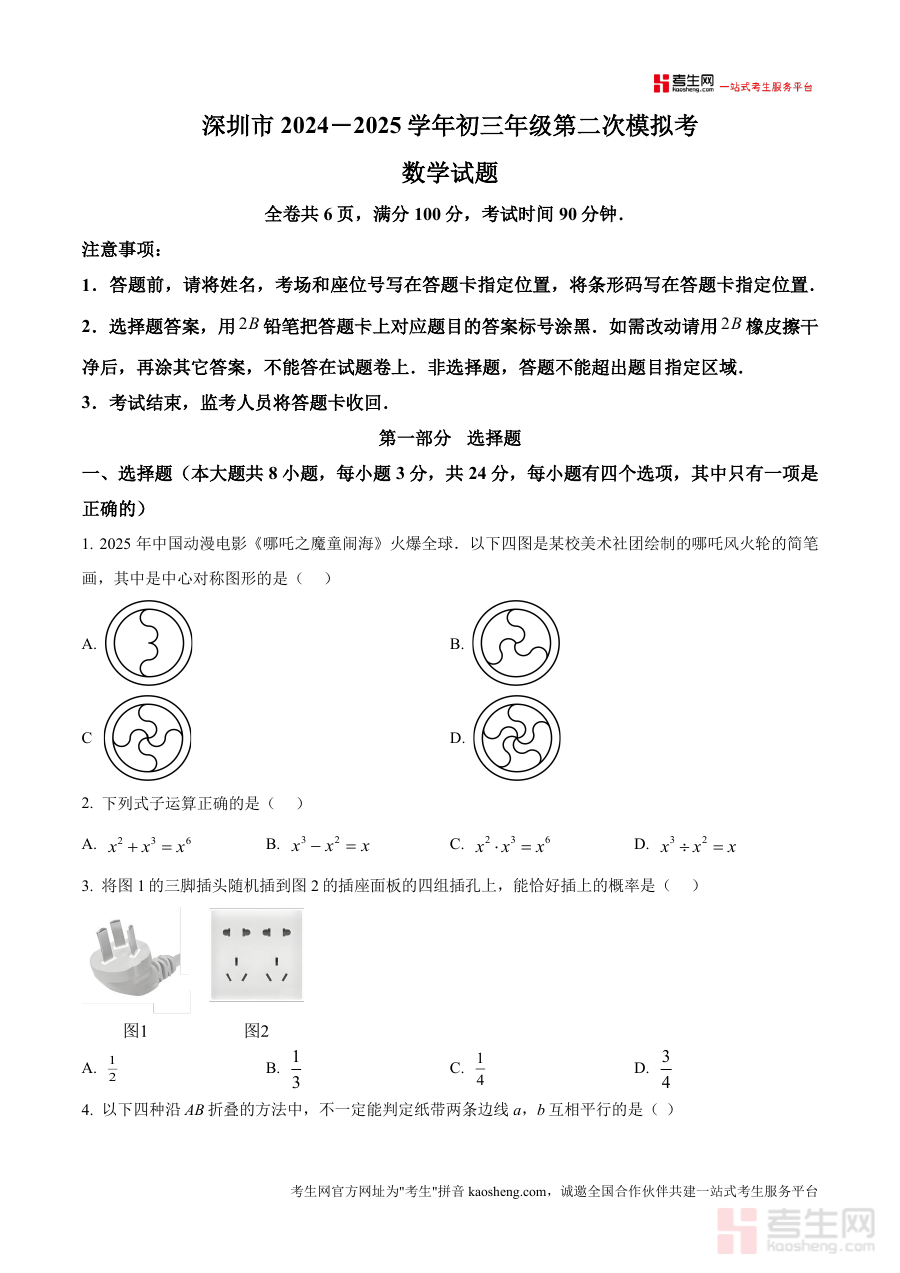 该资料适用于广东省深圳市九年级学生及从事中考数学辅导工作的教师等相关人员。作为中考前第二次模拟考试原卷资料,它能帮助使用者直观了解当前备考状态,明确阶段目标与方向,具有重要的阶段检测与备考辅助价值,助力使用者更好地应对中考数学科目的挑战。