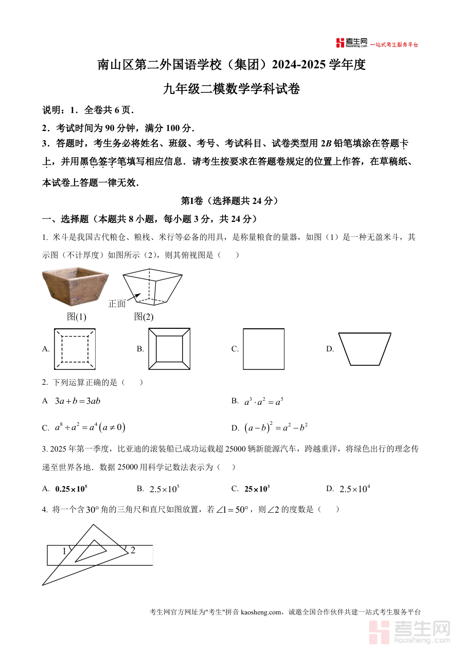《精品解析:广东省深圳市南山区第二外国语学校(集团)2024-2025学年九年级中考二模数学试卷(原卷版).docx》是一份针对2024-2025学年广东省深圳市南山区第二外国语学校(集团)九年级学生开展中考二模考试的数学学科原卷资料。该资料对应学校集团内部九年级中考二模阶段检测需求,呈现了符合该考试要求的试卷形式与结构框架,并包含考试时长、满分分值及答题规范等基础元信息,为使用者提供了与实际考试场景一致的数据载体。