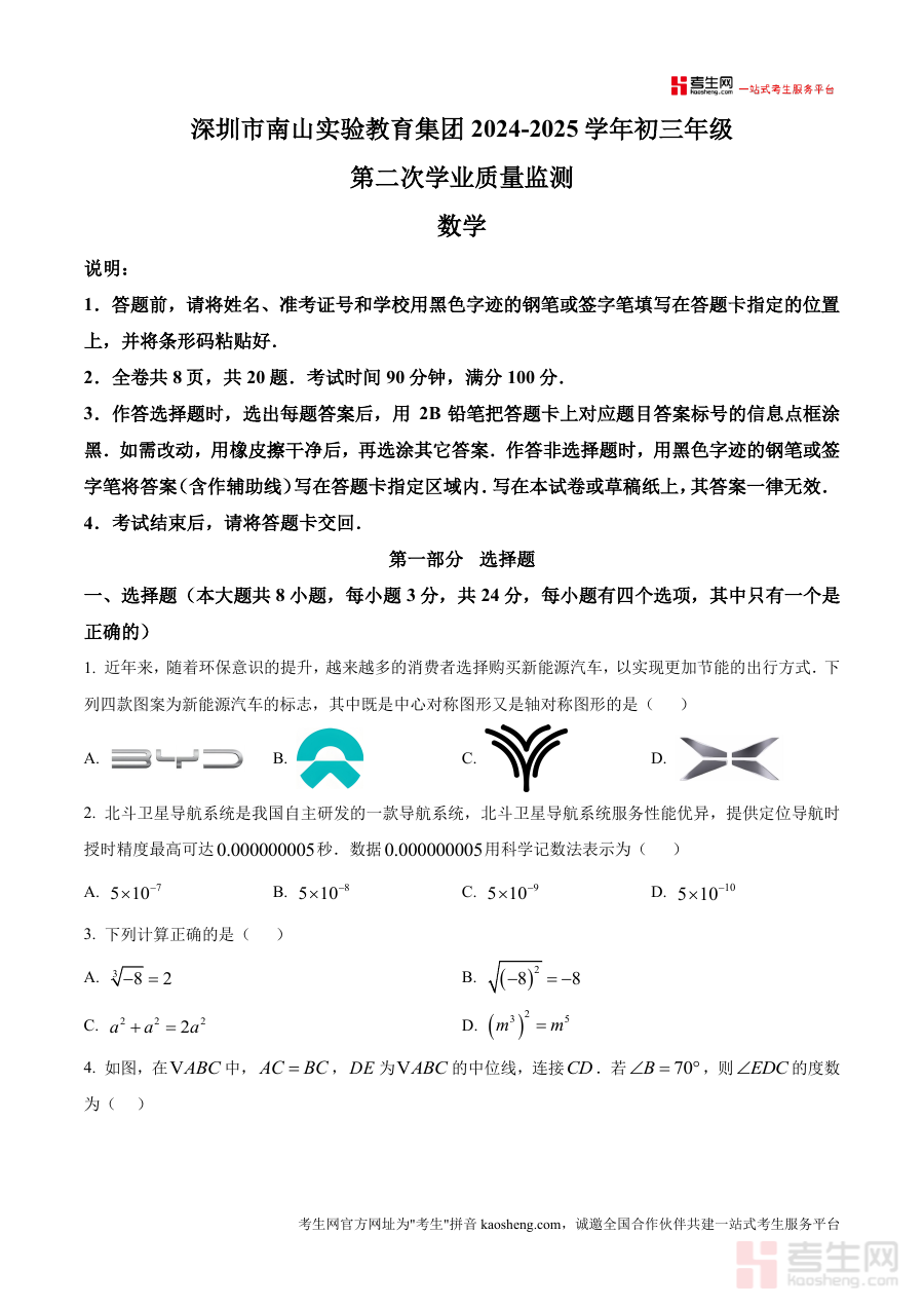 《精品解析:广东省深圳市南实南山实验教育集团2024-2025学年九年级下学期第二次学业质量监测数学试卷(二模)(原卷版)》是一份针对广东省深圳市南山实验教育集团2024-2025学年九年级下学期第二次学业质量监测(二模)设计制作的数学原卷资料。该资料对应集团内部九年级下学期二模考试阶段,承载着对学生数学学科阶段性学习成果进行评估的功能,其内容框架与结构安排均符合本次学业质量监测要求,为使用者提供了接触该次考试原始试卷形式与基本设置的直接途径。
