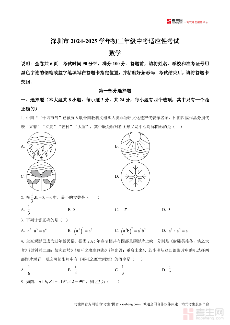 《精品解析:广东省深圳市坪山区部分学校2024-2025学年九年级中考适应性考试数学试卷(原卷版)》是一份针对广东省深圳市坪山区部分学校在2024-2025学年面向九年级学生开展中考适应性考试所设计的数学原卷资料。该资料对应中考备考阶段重要的适应性检测环节,能够真实反映该地区中考适应性考试的试卷基本框架与考查方向,为使用者提供贴合本地备考需求的检测载体。