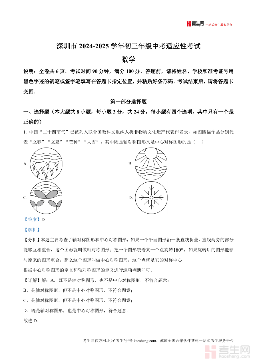 《精品解析:广东省深圳市坪山区部分学校2024-2025学年九年级中考适应性考试数学试卷(解析版)》是一份针对广东省深圳市坪山区部分学校2024-2025学年九年级中考适应性考试数学科目的专业备考资料,该考试属于九年级学生在中考前进行适应性训练和能力检测 的重要阶段性考试,覆盖坪山区内部分学校九年级学生群体,旨在帮助考生提前适应中考数学科目的考查模式与要求。