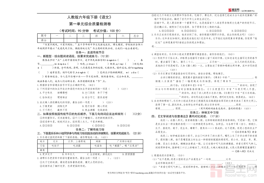 该检测卷适用于采用人教版教材体系的六年级学生及语文教师,也适合关注孩子语文学习进展的家长使用,作为第一单元学习后的阶段性检测工具,其设计贴合小学六年级语文教学目标与检测标准,具有较强针对性与实用性,能有效辅助教学与学习环节的闭环管理工作,助力教学质量提升与学生学习效果巩固.
