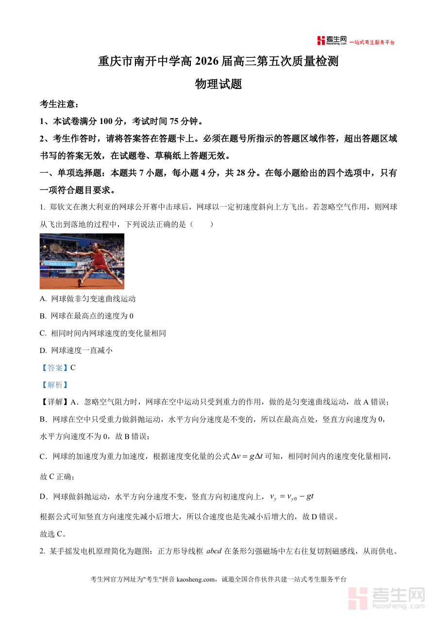 本资料适用于重庆市南开中学及同类学校2026届高三物理学习者也可供物理教师及备考辅导人员参考作为高三上学期第五次质量检测(一模)配套解析资料帮助学生诊断自身学习情况明确备考重点调整复习策略为后续一模考试及高考备考奠定基础同时辅助教师优化复习计划提升教学效果