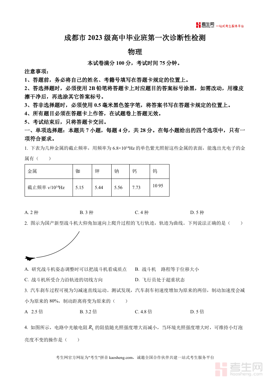 本资料适用于四川省成都市2023级高三学生群体及从事高三物理教学工作或备考辅导工作相关人员;作为高三上学期首次诊断性检测物理原卷资料对学生而言有助于检验自身学习状态明确后续复习重点;对教师及辅导人员而言可借助资料了解考试命题特点与趋势优化教学策略;其作为阶段检测重要参考资料具有较高实用价值助力使用者有效开展备考相关工作提升整体备考质量;