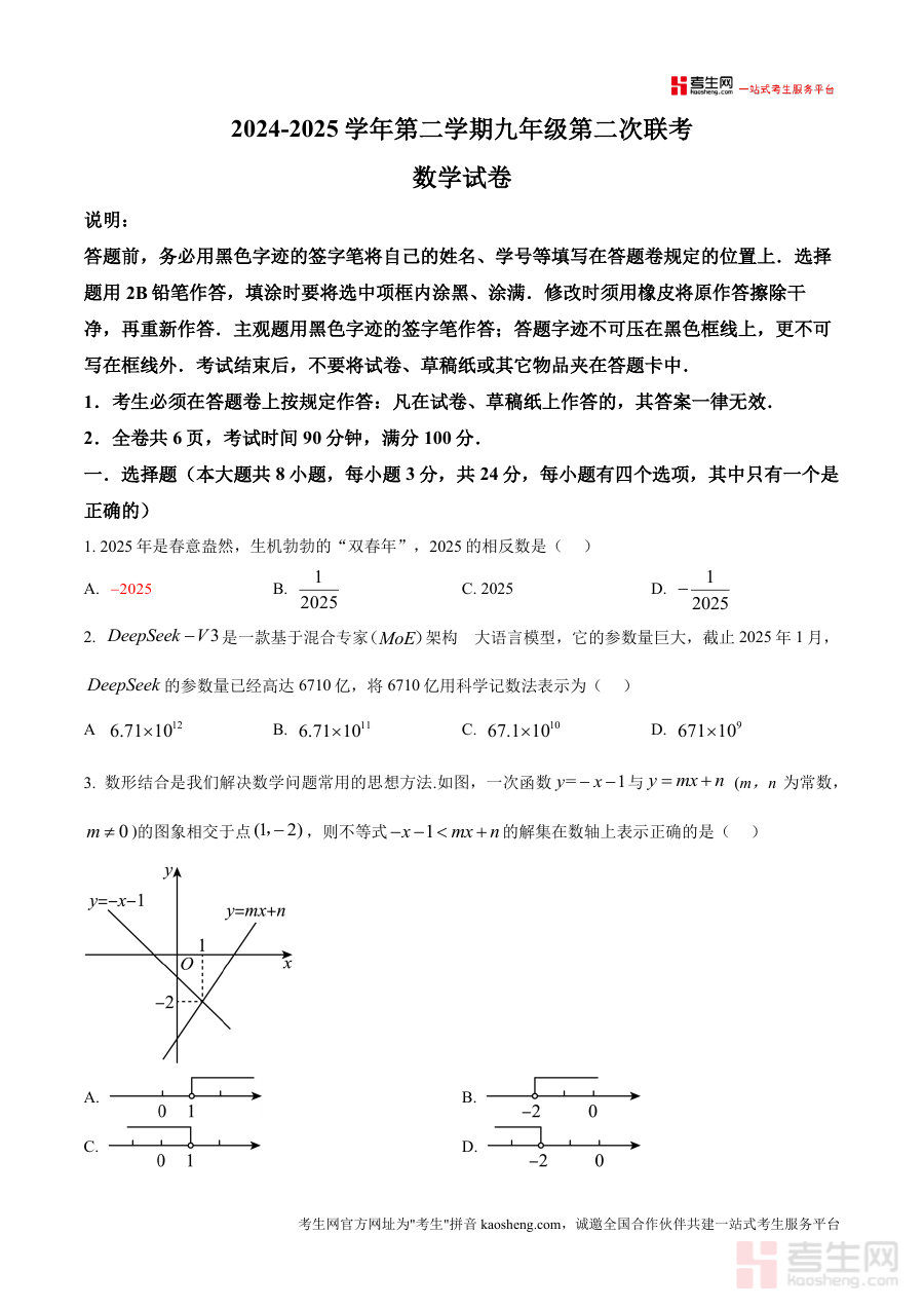 《精品解析:广东省深圳市福田外国语集团2024-2025学年下学期九年级第二次联考数学试卷(原卷版).docx》是一份对应广东省深圳市福田外国语集团2024-2025学年下学期九年级第二次联考的数学学科原卷版备考资料。该资料严格贴合该集团此次联考的考试安排与试卷规范,其呈现形式与该次联考官方试卷保持高度一致,为相关教学活动及考生备考提供了与实际考试完全一致的原卷载体。