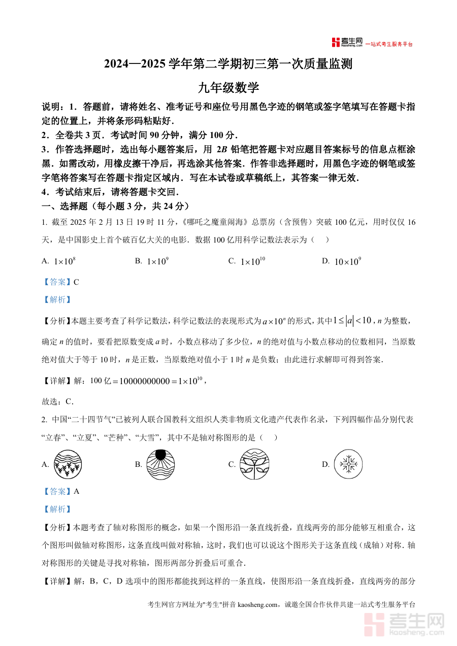 这份资料的用途主要体现在两个方面:一方面可为九年级学生提供该次质量监测数学试题 的完整练习及解析参考,帮助学生熟悉考试形式与作答规范;另一方面可作为教师开展教学评估与学情诊断 的辅助工具,助力教师了解学生阶段知识掌握情况,优化后续教学安排,为教与学提供针对性支持。
