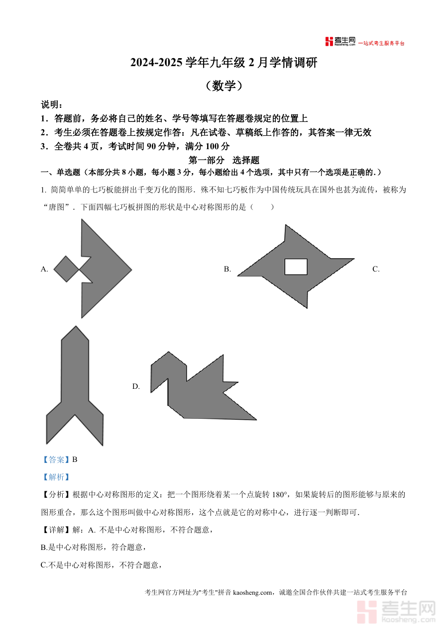 《精品解析:广东省深圳市龙华区实验学校2024-2025学年九年级下学期2月月考数学试卷(解析版)》是一份针对特定场景的数学学科备考辅助资料。它对应广东省深圳市龙华区实验学校在2024-2025学年九年级下学期开展 的二月数学月考,是基于该校当月学情调研需求编制的解析版本,旨在为相关使用者提供与本次月考直接相关的数据参考和内容支持。