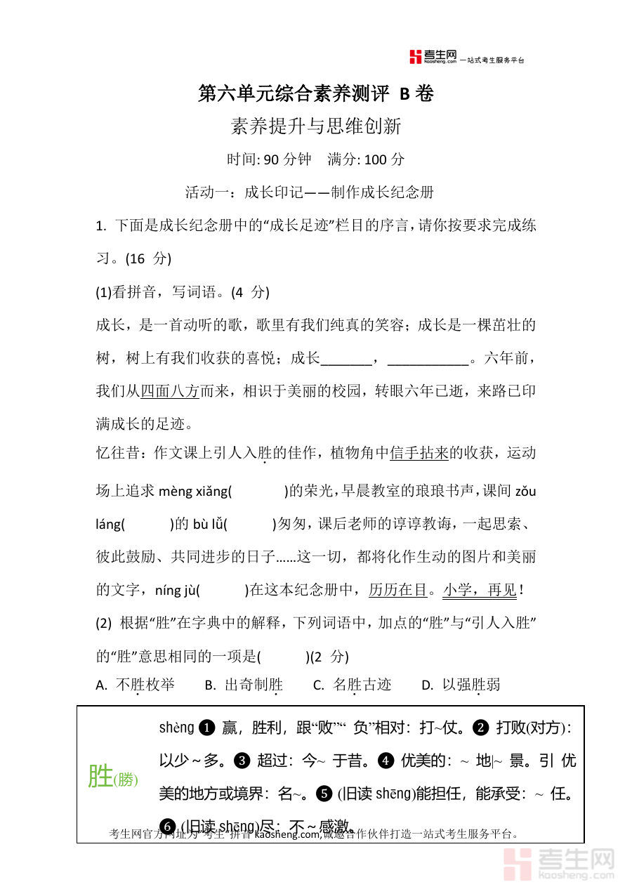 《[新更新]小学语文六年级下册第六单元综合素养测评 B卷(含答案).docx》是一份面向小学六年级下册第六单元设计的综合素养测评资料,包含该单元素养测评试题及对应参考答案,属于单元阶段综合测评类教育资料,为相关学习与教学活动提供检测依据,聚焦单元素养维度开展阶段性成果检验,无具体知识点编造内容。