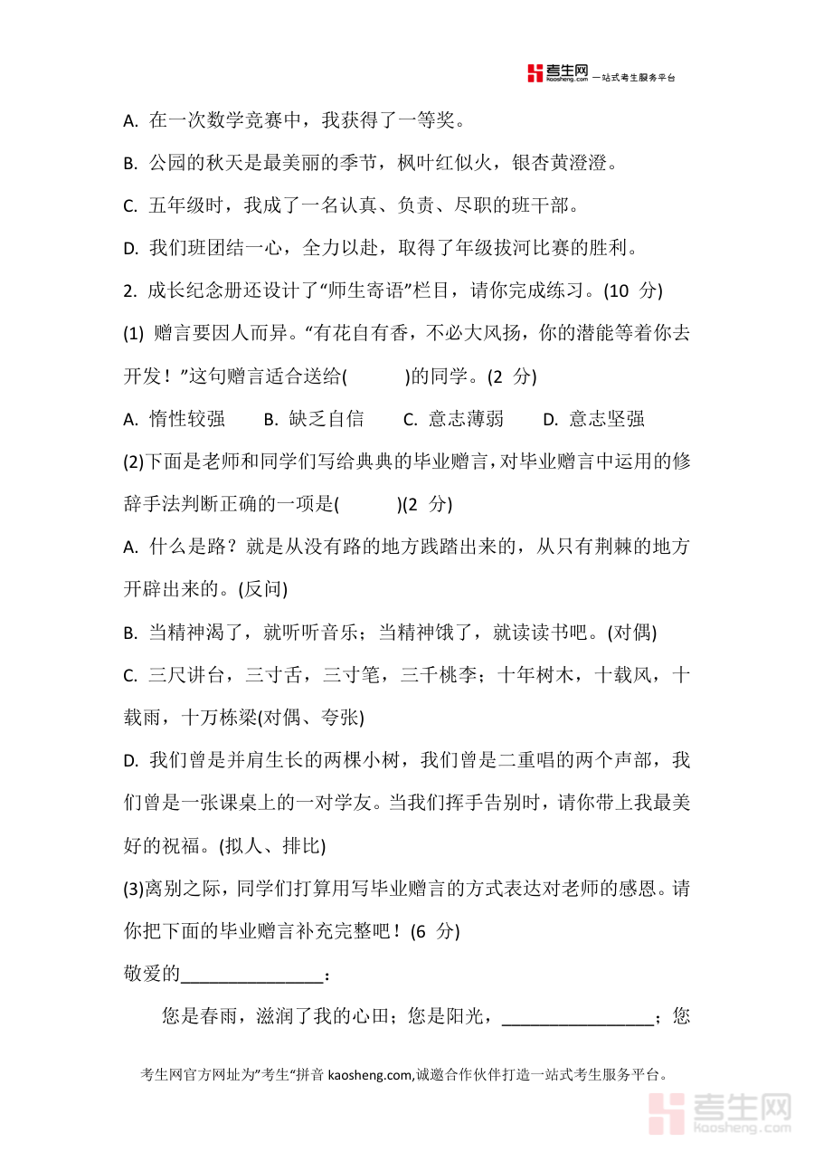 该资料适用于小学六年级学生及小学语文教师群体,尤其适合有第六单元阶段性素养评估与查漏补缺需求的使用者,其含答案设计便于快速核对结果,助力高效完成单元学习质量检验,为教学与学习活动提供针对性支持与参考依据,强调阶段检测的工具性价值而非具体提升点说明。