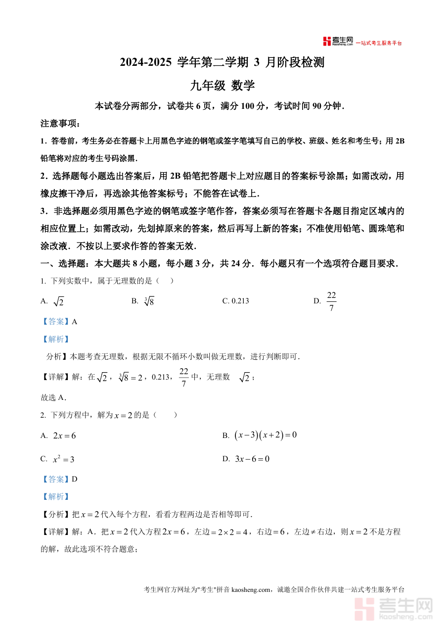 《精品解析:广东省深圳市龙华外国语学校2024-2025学年下学期3月份阶段检测九年级数学试题(解析版)》是一份针对广东省深圳市龙华外国语学校特定学年学期及考试类型编写且包含详细解析过程的资料,对应该校2024-2025学年下学期九年级数学学科3月份阶段检测场景,其属性明确指向特定学校、年级、学科及阶段检测环节,是该阶段检测的配套解析类资料。