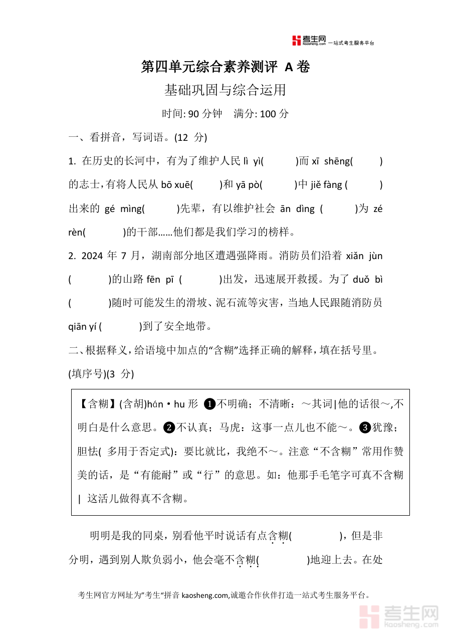 该资料可用于学生对第四单元知识与能力进行综合巩固及自我检测,帮助学生了解自身在本单元学习中的掌握情况;同时也可作为语文教师开展单元教学效果评估、学情分析及教学调整优化时的辅助工具,为教学决策提供参考依据,助力实现精准教学与针对性辅导目标。
