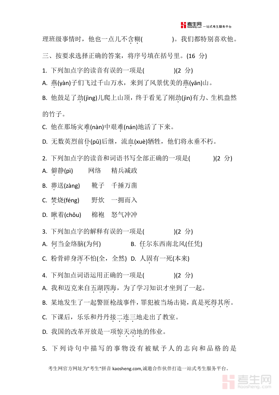 本资料适用于小学语文六年级学生及该年级语文教师、课外辅导人员等群体,可作为单元学习结束后的阶段性测评材料,既能够帮助学生查漏补缺,明确后续学习方向,也能够辅助教师掌握班级整体学习状况,提升教学质量与效率,具有较强的实用价值。