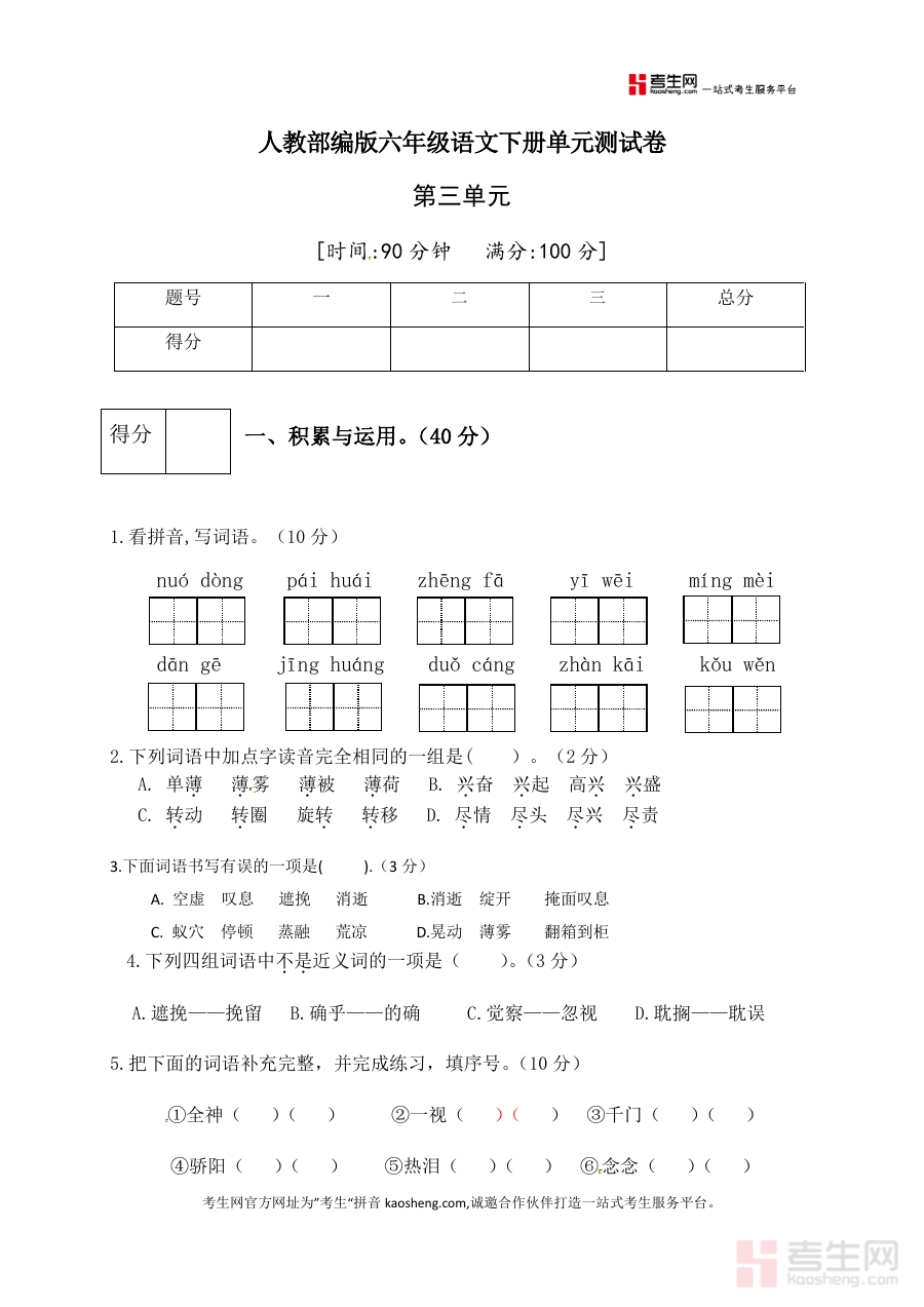《人教部编版六年级语文下册第三单元测试卷3(有答案)》是一份严格适配人教部编版教材体系、专门针对小学六年级语文下册第三单元知识内容设计的标准化单元测试资料附带完整参考答案为该阶段学生提供专业单元学习成果检测工具不涉及任何具体知识点或题型细节描述仅作为单元学习效果量化评估与反馈的有效载体完全符合小学六年级语文教学阶段性检测的核心需求