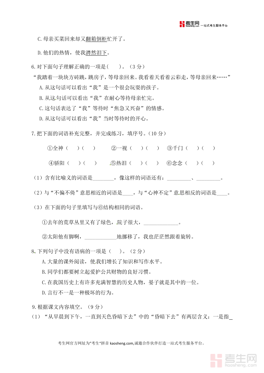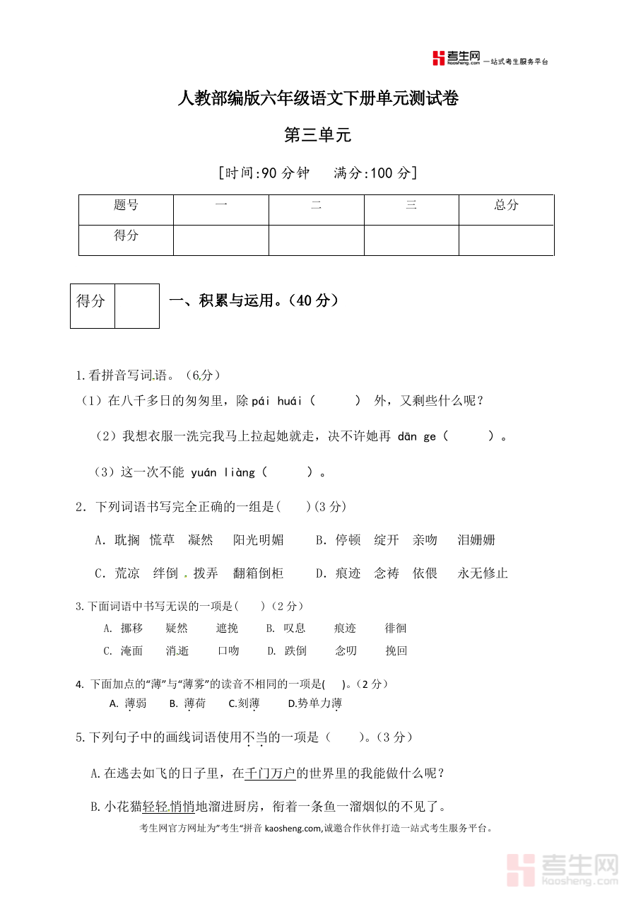《人教部编版六年级语文下册第三单元测试卷5(有答案)》是一份针对人教部编版六年级语文下册第三单元设计的标准化测试资料,包含完整测试卷及配套参考答案。它依据该单元教学目标与内容框架编制而成,属于阶段性检测类资料,旨在为单元学习效果评估提供科学工具与数据支持。