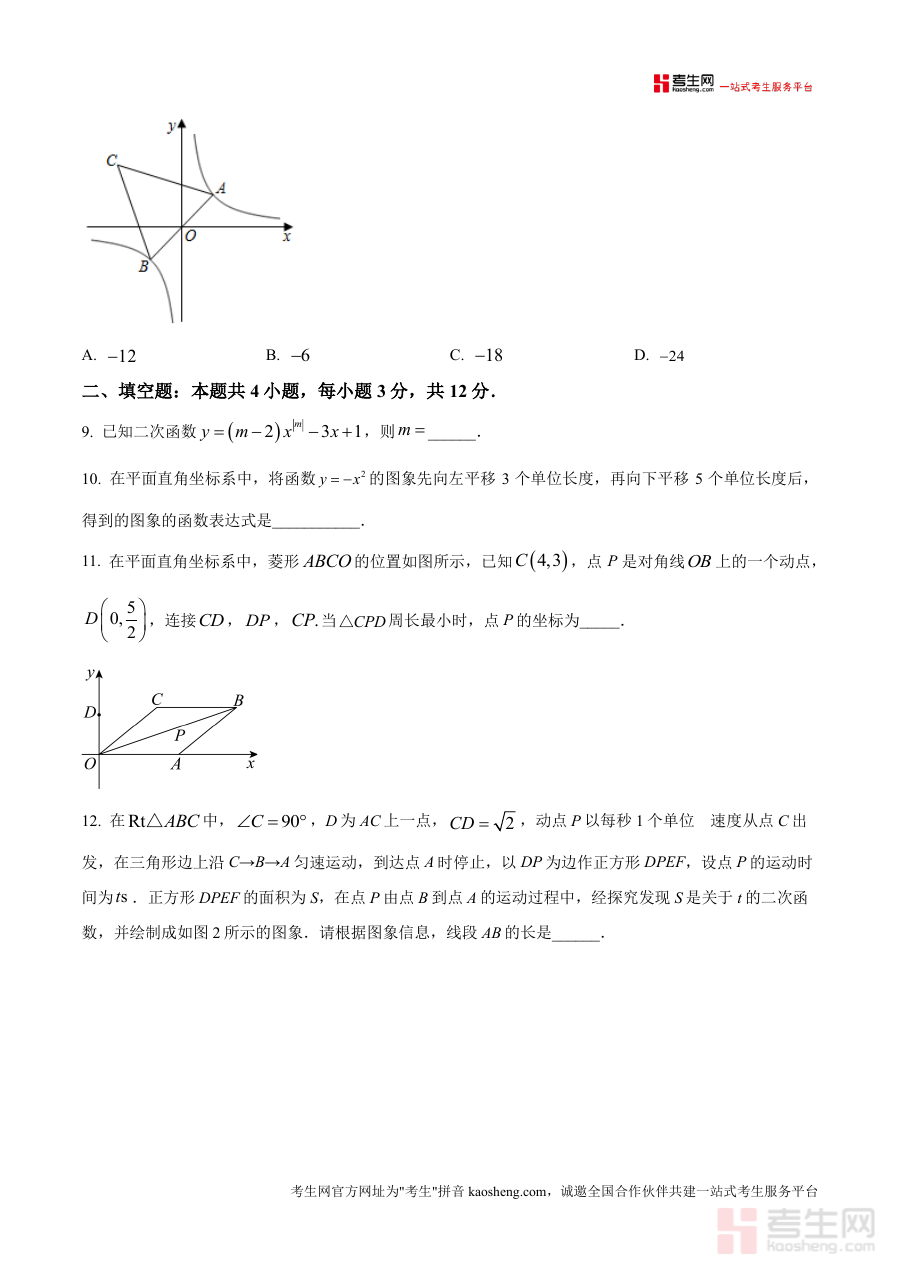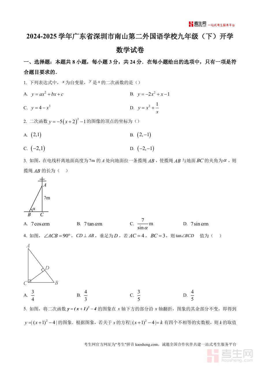 《精品解析:广东省深圳市南山区第二外国语学校2024-2025学年九年级下学期开学考试数学试卷(原卷版)》是一份针对广东省深圳市南山区第二外国语学校特定学年学期及考试类型设计的备考资料,明确对应该校2024-2025学年九年级下学期开学阶段数学考试,为相关使用者提供贴合该校实际教学进度与考试需求的参考材料,不包含具体知识点解析内容,仅呈现考试原题形式及结构框架。