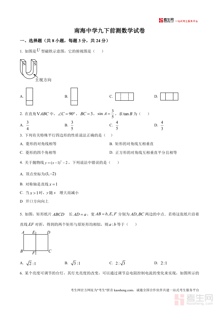 《精品解析:广东省深圳市南山实验教育集团南海中学2024-2025学年九年级下学期开学考数学试题(原卷版)》是一份针对广东省深圳市南山实验教育集团南海中学在2024-2025学年九年级下学期开学阶段组织实施的数学考试所设计的原卷版备考资料。该资料严格对应目标考试场景,呈现原始试题内容框架,确保与实际考试的高度匹配性,为使用者提供直接关联该次考试的数据支撑,助力使用者快速对接考试要求。