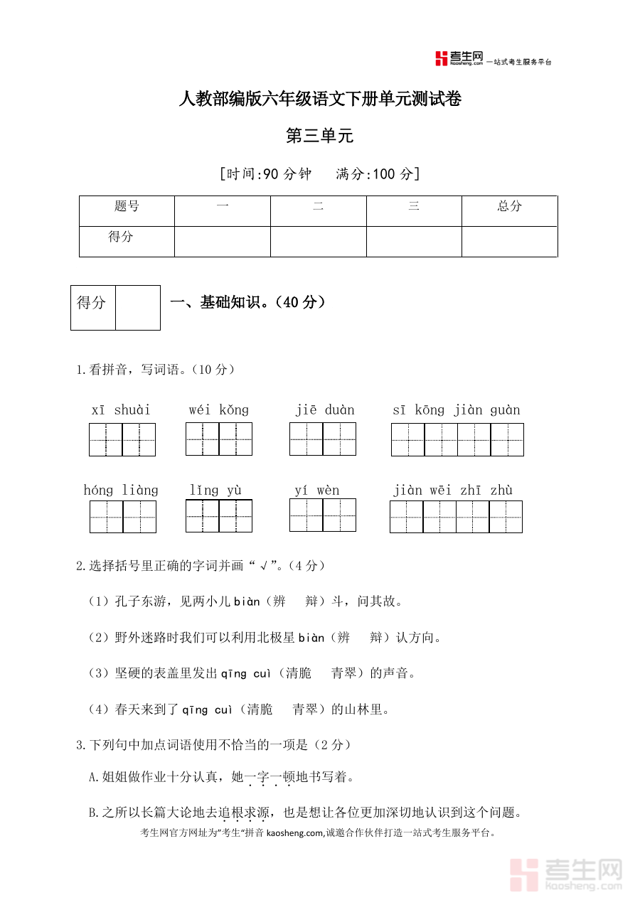 其适用对象为使用人教部编版语文教材的六年级学生及该学段语文教学工作者,作为单元阶段性检测载体,能为使用者提供直观学习反馈支持,助力高效巩固单元知识体系,具备较强实用性与针对性。