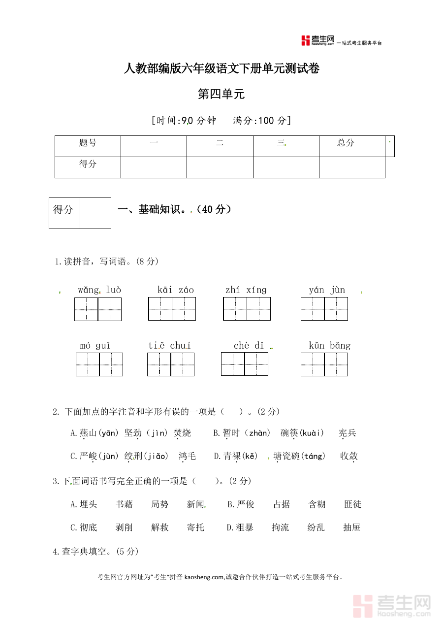 《人教部编版六年级语文下册第四单元测试卷2(有答案).docx》是一份针对人教部编版六年级语文下册第四单元的单元测试资料。它属于阶段性学习检测类材料,严格依据人教部编版教材第四单元的教学范围设计,为相关教学活动提供标准化的测试载体。该资料包含完整的测试内容及配套答案部分,是单元学习结束后进行知识评估的实用工具。
