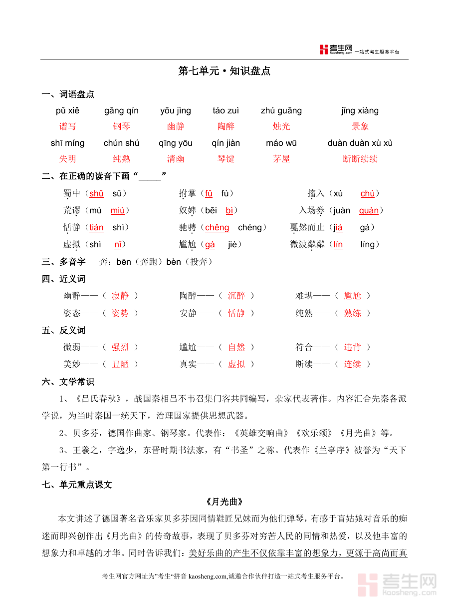 该资料可用于六年级上册语文第七单元学习结束后的知识巩固、学习效果检测,帮助使用者快速梳理单元关键内容框架,通过测试环节了解自身对单元知识及能力要求的掌握情况,为后续学习调整提供参考方向,同时含答案设计便于自主核对与反馈提升过程开展,满足阶段性学习评估需求。