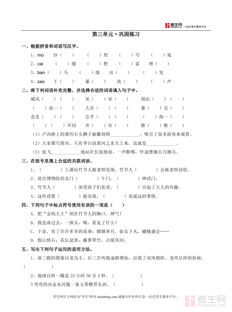 这份资料主要用于六年级学生完成第三单元学习后的知识梳理与能力评估,帮助学生系统回顾单元积累与技能要点,通过测试检验学习成效;同时可为教师开展单元教学总结与学情分析提供标准化工具,辅助优化教学策略。