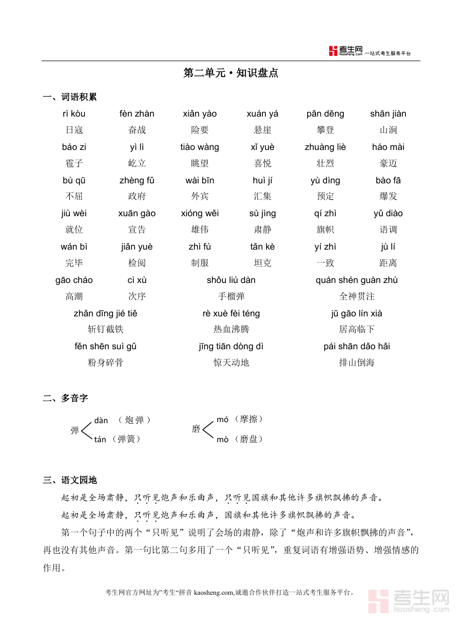 该资料适用于使用部编版教材的六年级学生及语文教师群体。对学生而言,可通过知识盘点夯实基础,通过测试了解自身学习短板;对教师而言,可利用测试内容进行课堂检测或作业布置,助力教学目标达成与教学策略优化,是单元学习阶段实用的辅助资料。