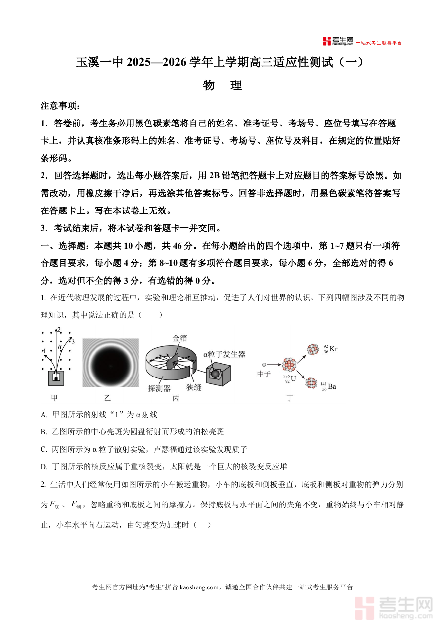 《精品解析:2026届云南省玉溪第一中学高三上学期模拟预测物理试题(一)(原卷版)》是一份针对云南省玉溪第一中学2025—2026学年高三上学期第一次模拟预测物理考试设计的原卷版备考资料,其考试类型属于高三上学期阶段适应性检测范畴,旨在匹配该学校高三学生物理学科阶段性学习进度与评估需求,资料严格遵循该次考试相关规范要求编制,确保内容形式与实际考试保持一致,不包含额外编造信息,仅基于考试本身元信息呈现原卷内容框架。