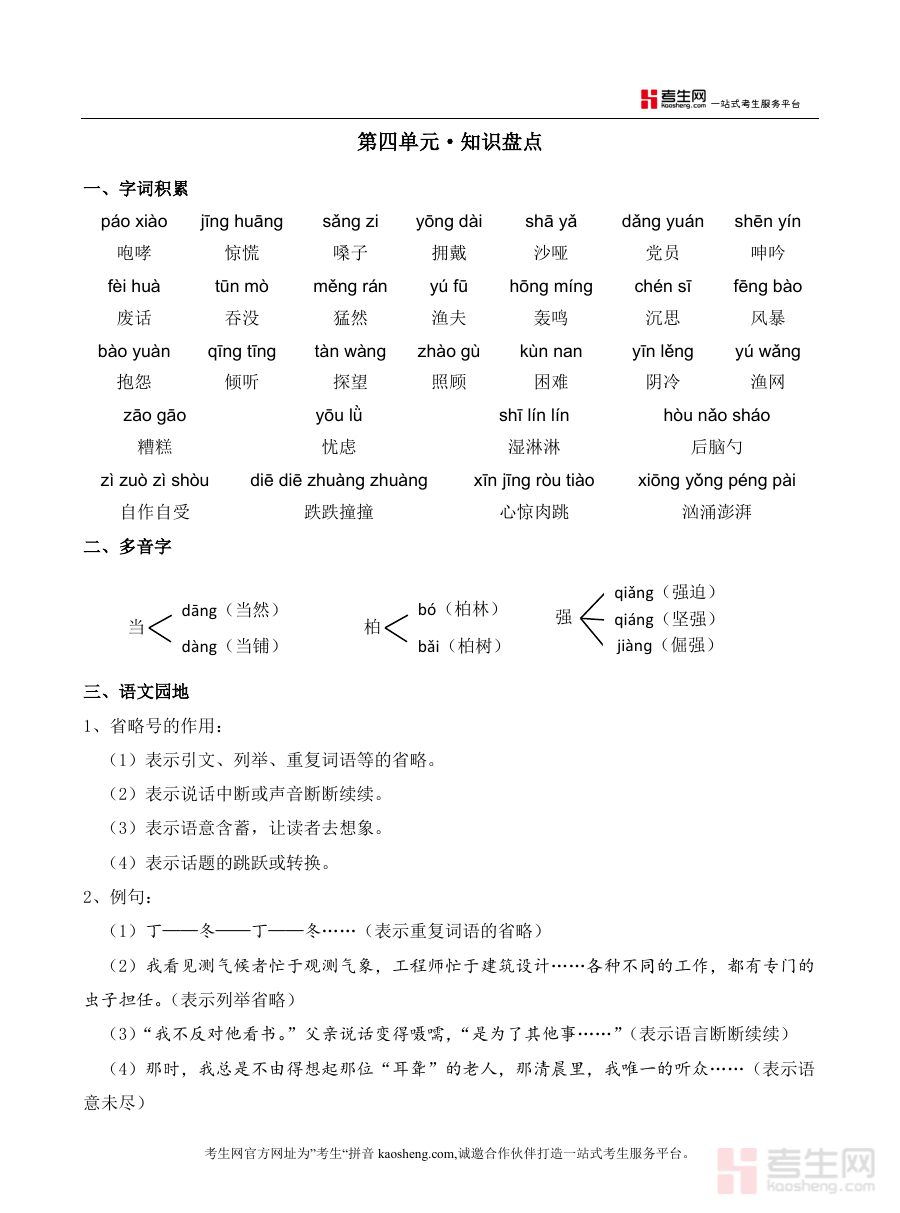 这份资料可用于六年级学生对第四单元知识进行梳理巩固与自我检测,帮助学生清晰掌握自身对本单元知识要点的熟悉程度;同时也可作为语文教师开展单元教学评估、学情分析及辅导规划时的参考材料,辅助教师更高效地完成单元教学相关任务。