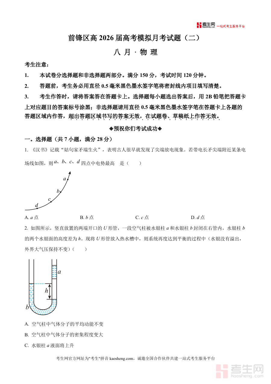 《精品解析:2026届四川省广安市前锋区高三上学期8月模拟预测物理试题(原卷版).docx》是一份面向2026届四川省广安市前锋区高三学生推出,对应高三上学期8月物理模拟预测考试的原卷型备考资料,精准匹配该地区高三年级在8月阶段开展物理模拟预测考试所需场景与规范要求,提供了符合考试流程与形式标准的试卷载体,是该阶段物理学科备考活动的重要支撑资料之一。