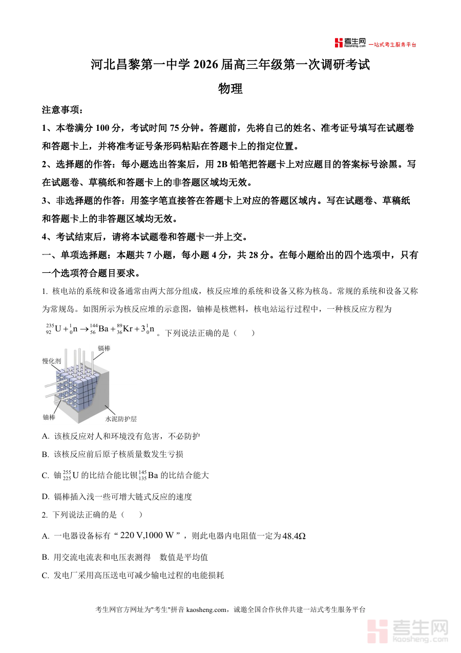 《精品解析:2026届河北省秦皇岛市昌黎第一中学高三上学期第一次调研考试物理试题(原卷版).docx》是一份面向2026届河北省秦皇岛市昌黎第一中学高三学生推出的物理学科备考资料,对应该校高三上学期第一次调研考试场景,呈现该次物理考试原始试卷形态,包含考试时长、满分分值及答题操作规范等符合官方考试要求元信息,未添加额外解析或答案内容,仅保留试卷原始结构与形式框架。