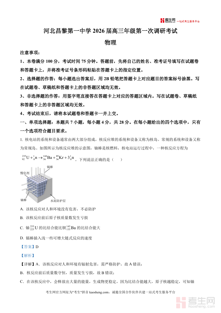 《精品解析:2026届河北省秦皇岛市昌黎第一中学高三上学期第一次调研考试物理试题(解析版).docx》是一份针对河北省秦皇岛市昌黎第一中学2026届高三学生设计制作物理学科备考资料,对应该校高三上学期第一次调研考试。该资料以学校官方考试试题为基础提供完整专业解析内容,旨在帮助学生和教师全面了解本次调研考试整体情况把握考试方向重点,为后续物理学科学习和备考提供参考依据确保备考工作有的放矢,符合学校教学进度和学生实际需求。