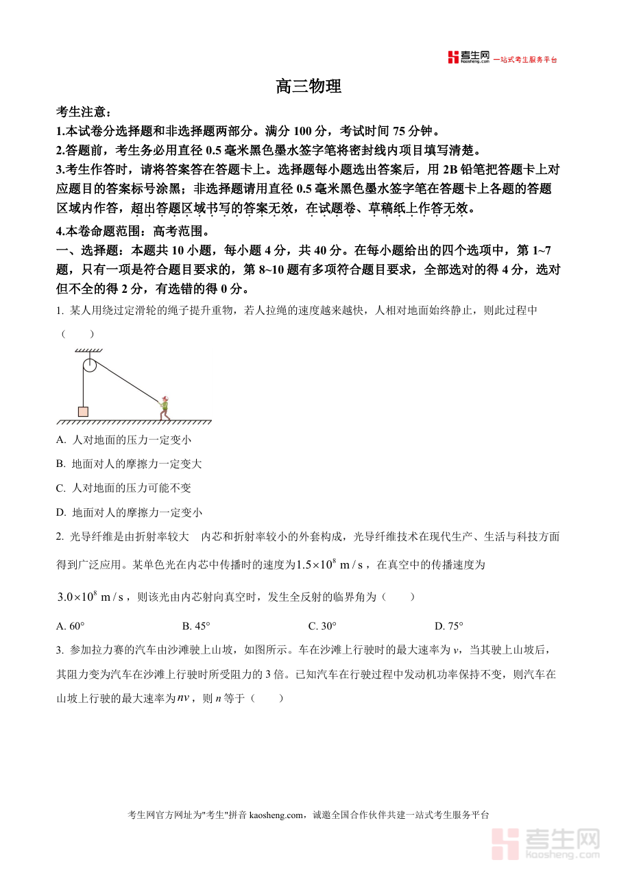 《精品解析:2026届湖北省武汉市九师联盟高三上学期8月开学考试物理试卷(原卷版)》是一份针对2026届湖北省武汉市九师联盟高三学生上学期8月开学考试设计的物理学科原卷版备考资料。它对应特定地区联盟组织的开学阶段考试场景,为相关备考活动提供了符合该考试时间(75分钟)、满分(100分)及命题范围(高考范围)等要求的原始试卷载体,体现了该考试的基本规范特征。