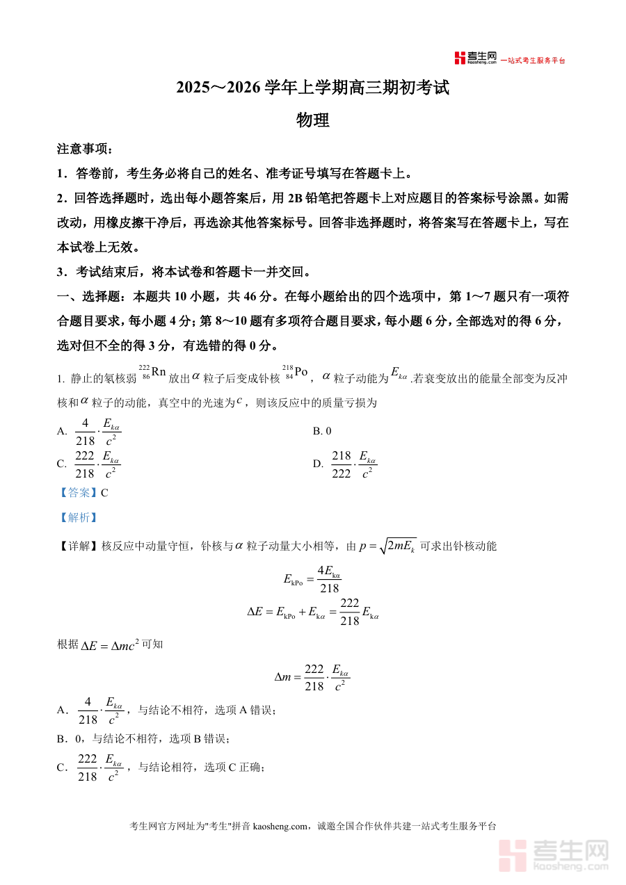 《精品解析:云南省煤炭第一中学等学校2025-2026学年高三上学期期初考试物理试题(解析版)》是一份针对特定时段与区域学校考试编制的物理学科备考资料。其对应考试为2025-2026学年云南省煤炭第一中学等学校组织 的高三上学期期初物理考试,资料类型为包含试题解析 的版本,旨在提供与该考试直接相关的专业解析内容支持,帮助使用者获取该期初考试物理试题 的对应解析信息。