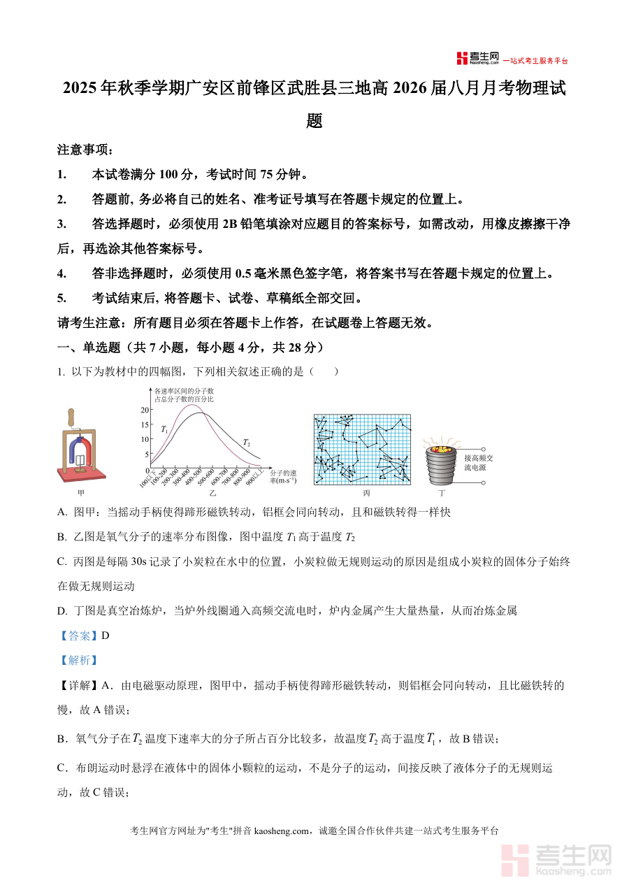 《精品解析:四川省广安市广安三区联考2025-2026学年高三上学期8月月考物理试题(解析版)》是一份针对四川省广安市广安区、前锋区、武胜县三地2025-2026学年高三上学期8月联合月考物理科目的专业备考资料,对应高三开学初期阶段检测考试需求,整合了本次联考物理试题及详细解析内容,为使用者提供了本次考试物理科目的完整资料框架,不包含任何未明确提及或编造性内容,确保信息基于文件元数据准确呈现.