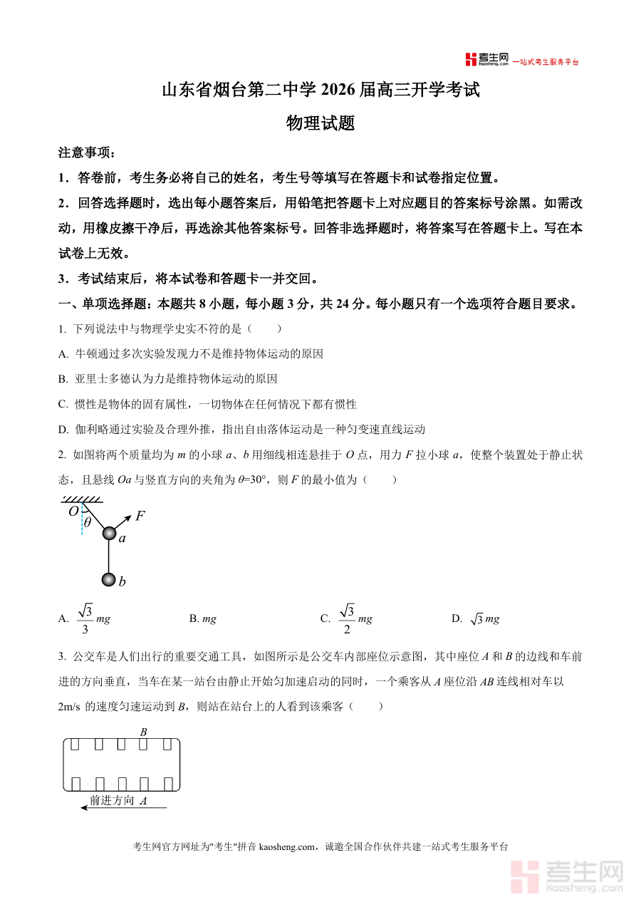 适用人群为山东省烟台第二中学2026届高三学生以及该校物理学科教师、相关备考辅导人员;对于学生而言它是开学阶段检测自身物理水平并熟悉考试形式重要资料;对于教师及辅导人员则是了解该次开学考试物理试题结构辅助教学与备考规划实用参考工具;其核心价值在于提供真实开学考试物理试题原卷形式助力使用者把握阶段检测需求与方向。