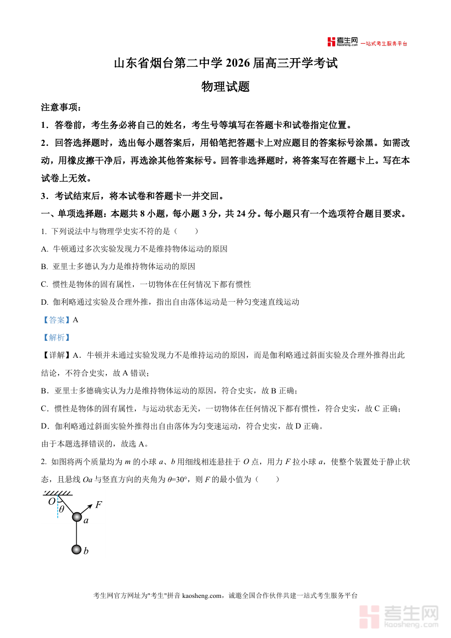 本资料适用于山东省烟台第二中学高三学生及相关备考辅导人员群体使用。对于学生而言,它是评估自身物理学科基础水平、调整学习策略并制定个性化学习计划的重要参考工具;对于教学人员而言,它可以作为学情分析依据帮助把握学生整体学习状况,优化教学方案与辅导策略。作为高三学年起始阶段的重要学科参考资料,它能够有效辅助使用者建立清晰的学习目标与路径规划框架,实现阶段性学习效果评估与提升方案设计,为整个高三学年物理学科学习奠定基础。