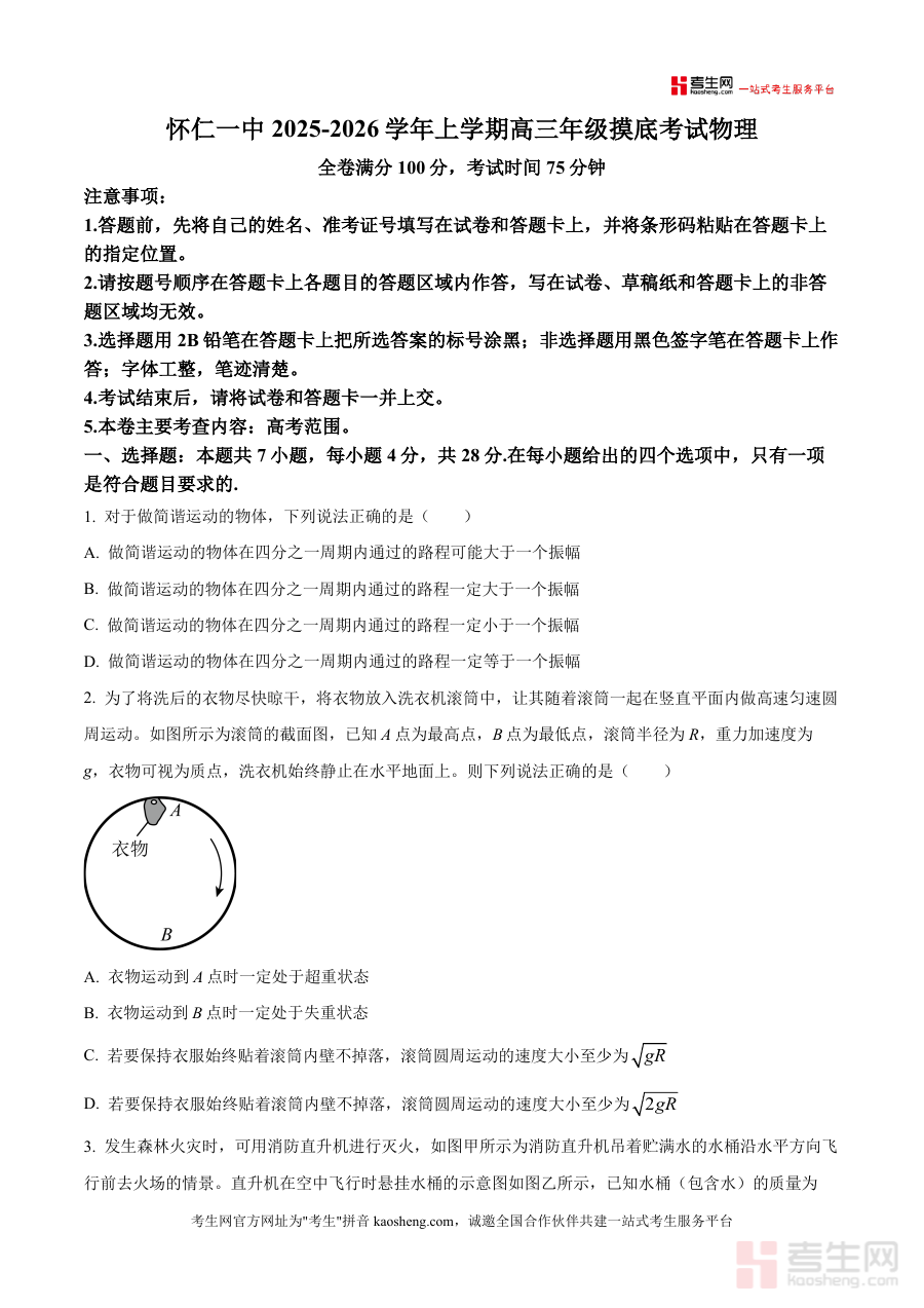 《精品解析:山西省朔州市怀仁市第一中学校2025-2026学年高三上学期开学摸底考试物理试题(原卷版)》是一份针对山西省朔州市怀仁市第一中学校特定学年特定阶段物理学科摸底考试的原始试卷资料。该资料完整呈现了2025-2026学年高三上学期开学初期组织摸底考试的物理试卷全貌,包含考试时间、满分设置及答题注意事项等核心考试信息要素,能够真实反映此次摸底考试物理学科的命题形式与试卷结构特点,是了解怀仁一中该次物理摸底考试具体安排与规范要求直接载体,对于把握考试整体框架具有重要参考价值。
